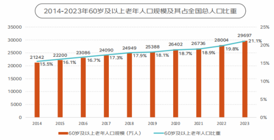 我国银发族人口规模不断扩大,截至2023年末,我国60岁及以上人口达到29697万人,占全国总人口的21.1%;到2035年左右,60岁及以上老年人口将突破4亿,在总人口中的占比将超过30%,进入重度老龄化阶段。