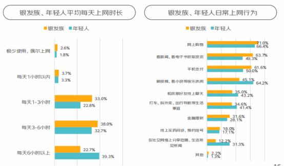 60.7%的银发族平均每天手机上网时长超过3小时,仅有2.6%的银发族极少上网,网上购物、看新闻资讯、手机支付、刷视频等娱乐休闲成为银发族日常上网主要事宜。